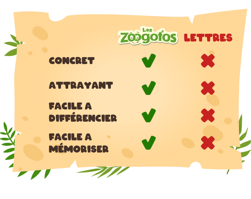 Les Zoogotos apprennent aux enfants le son que fait chaque lettre, en commençant par les voyelles, dont le son est plus facile à reconnaître.